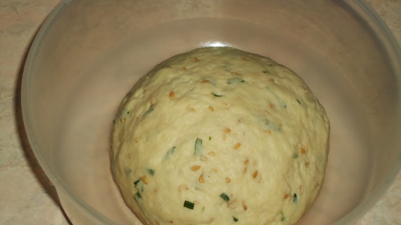 Tritate gli aghi di rosmarino. Impastate la farina, l’acqua, il rosmarino tritato, il sesamo, l’olio, il vino ed un pizzico di sale. Formate una palla, avvolgetela nella pellicola e fatela riposare 30 minuti.