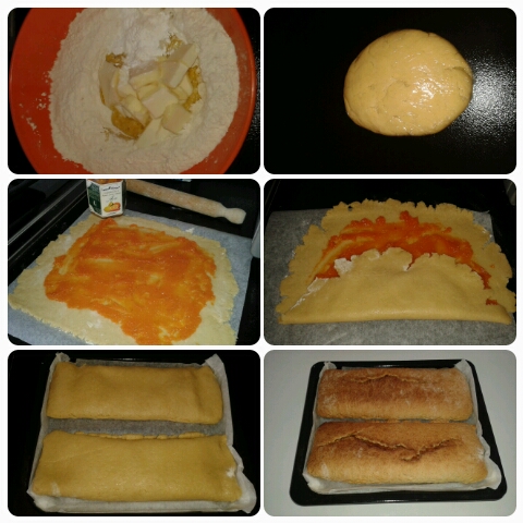 Impastate sulla spianatoia la farina setacciata con lo zucchero, la scorza di limone e arancia, il lievito e le uova, poi unite il burro e modellate un impasto ben compatto. Avvolgete l’impasto nella pellicola trasparente e mettete a riposare in frigorifero per 30 minuti. Riprendete l’impasto dal frigorifero e tagliatelo a metà. Stendete entrambi le metà con il mattarello abbastanza sottile, poi spalmatevi sopra la marmellata di limoni lasciando i bordi (1 cm circa) senza marmellata. Arrotolate l’impasto con 2 pieghe, sigillate bene i bordi e disponete su carta da forno