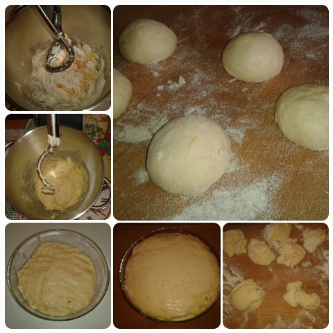 Setacciate la farina e unite lo zucchero. Fate sciogliere il burro senza farlo cuocere. Frullate la zucca con il latte per ottenere una cremina omogenea, poi aggiungete il lievito di birra, le farine con lo zucchero e il burro sciolto. Impastate a mano ( o nella planetaria con il gancio) per alcuni minuti fino a quando otterrete una bella palla di impasto (rimarrà leggermente umida, non vi preoccupate, così deve essere!!!). Mettete l’impasto a riposare in una bella terrina capiente coperta con un canovaccio, dovrà lievitare fino a quando avrà raddoppiato di volume. Prendete la pasta senza impastarla troppo e formate tante palline di circa 55 g l’una e disponetele in una teglia ricoperta da carta da forno.Lasciate riposare per un’oretta.