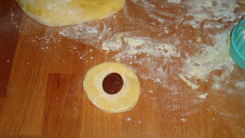 poi stenderlo e ricavare dei dischetti su cui mettere un cucchiaino di crema spalmabile alle nocciole, posizionare sopra un altro dischetto,