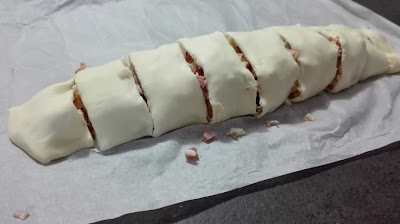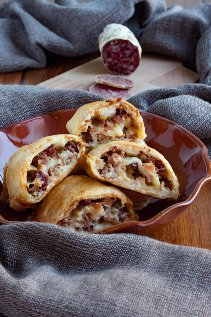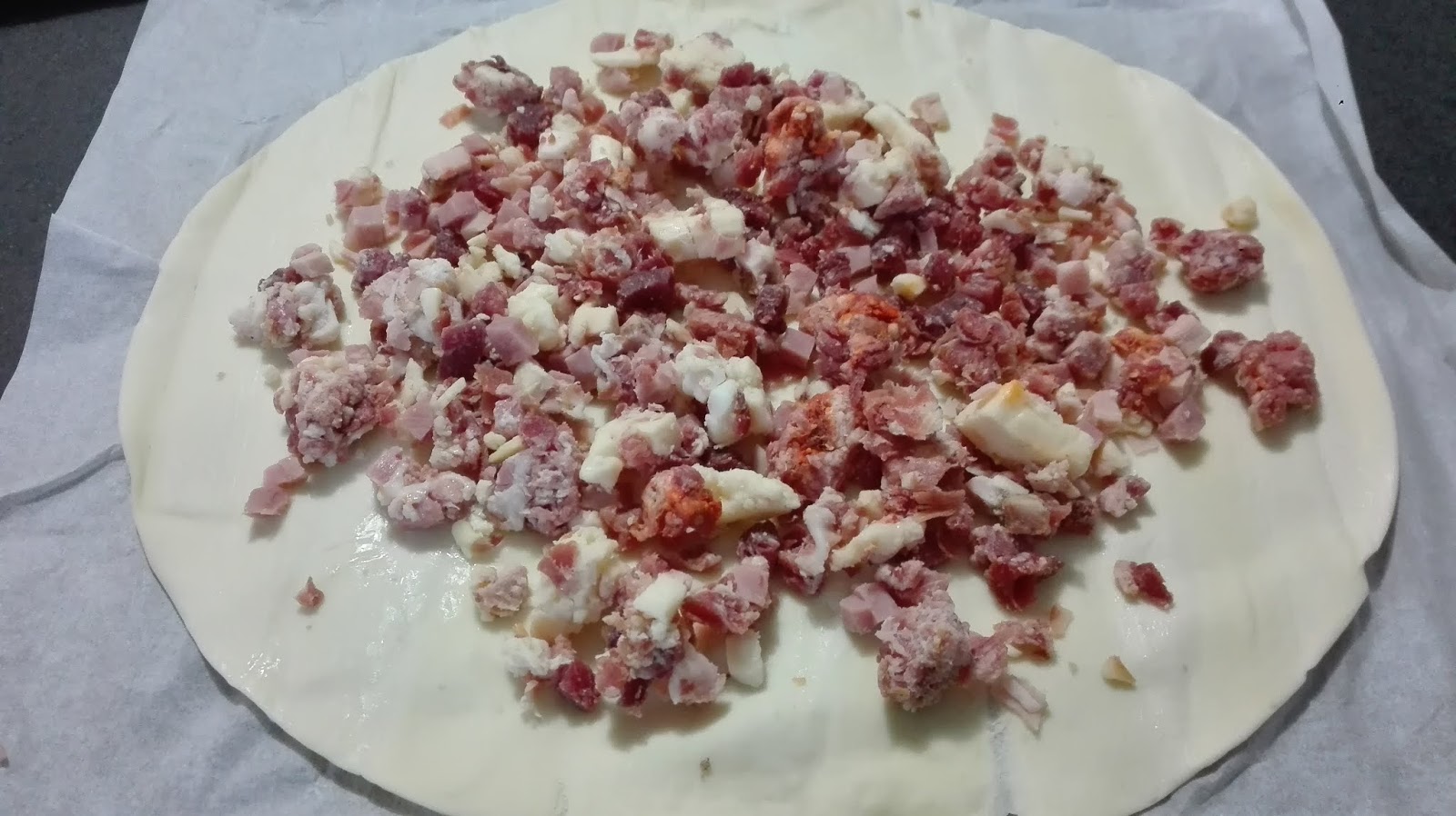 Disponete un rotolo di pasta sfoglia sulla carta da forno e ricopritela con uno strato omogeneo di salumi e provola a cubetti. Lasciate circa due centimetri di pasta sfoglia ai bordi senza ripieno e cominciate ad arrotolare bene la sfoglia.